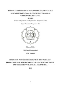 Riki, Yakob Kamengkari (2023) UBUNGAN PENGETAHUAN DENGAN PERILAKU MENGELOLA SAMPAH RUMAH TANGGA DI PEDUKUHAN TEGALREJO GIRIREJO IMOGIRI BANTUL. Skripsi thesis, SEKOLAH TINGGI ILMU KESEHATAN WIRA HUSADA.