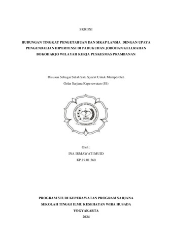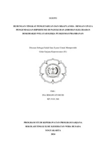 Tujuan Penelitian: Untuk mengetahui “Hubungan Tingkat Pengetahuan dan Sikap Lansia Dengan Upaya Pengendalian Hipertensi Di Padukuhan Jobohan Kelurahan Bokoharjo Wilayah Kerja Puskesmas Prambanan”